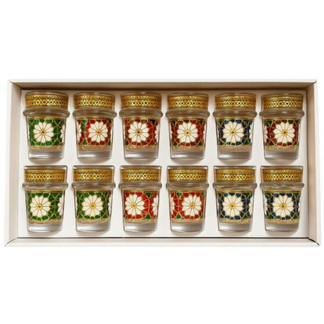 Marokkaanse theeglazen met een goudkleurig mozaïekpatroon en kleurrijke bloemaccenten (set van 12)